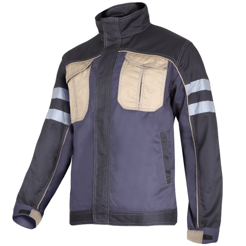 Odzież wykonano z materiału o gramaturze 245g/m2 (35% bawełny, 65% poliestru) w kolorze czarno-szaro-beżowym z pasami odblaskowymi poprawiającymi widoczność pracownika podczas pracy. Bluzy robocze posiadają 4 kieszenie w tym dwie zapinane na rzep. wzmocnione materiałem 600D poliester odpornym na przetarcia. Dół bluzy i rękawy regulowane są za pomocą rzepów. W odzieży znajduje się wszywka identyfikacyjna.