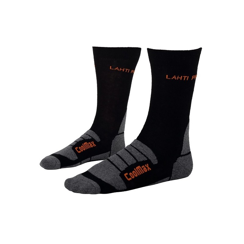 Skarpety robocze termiczne w kolorze szaro-pomarańczowym, zakończone ściągaczem idealnie dopasowują się do kształtu stopy. Technologia Coolmax zapewnia wysoką oddychalność oraz szybkie odprowadzanie wilgoci. Elastyczne strefy o specjalnym splocie utrzymują skarpety we właściwym miejscu.